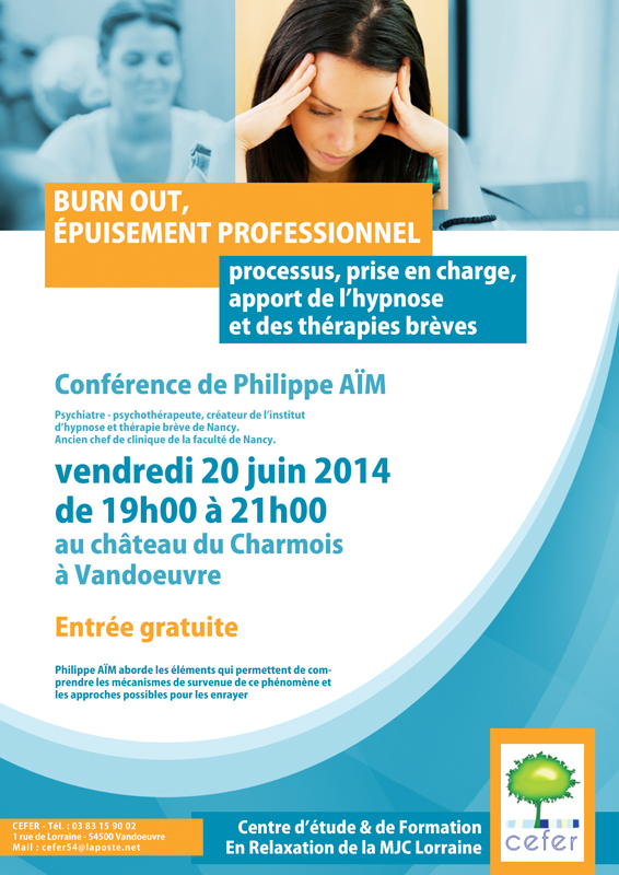 Conférence du Dr Philippe AÏM: BURN OUT, Epuisement Professionnel. Processus, Prise en Charge, Apport de l'Hypnose et des Thérapies Brèves.